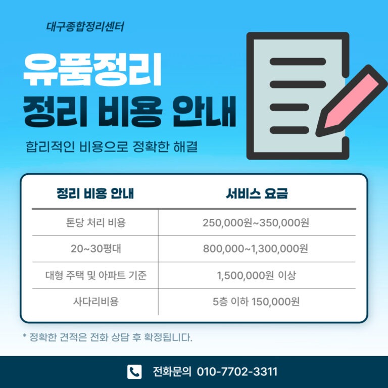 소량의 정리의 경우 전화 또는 사진을 통하여 정확한 비용을 확인이 가능하게 됩니다.